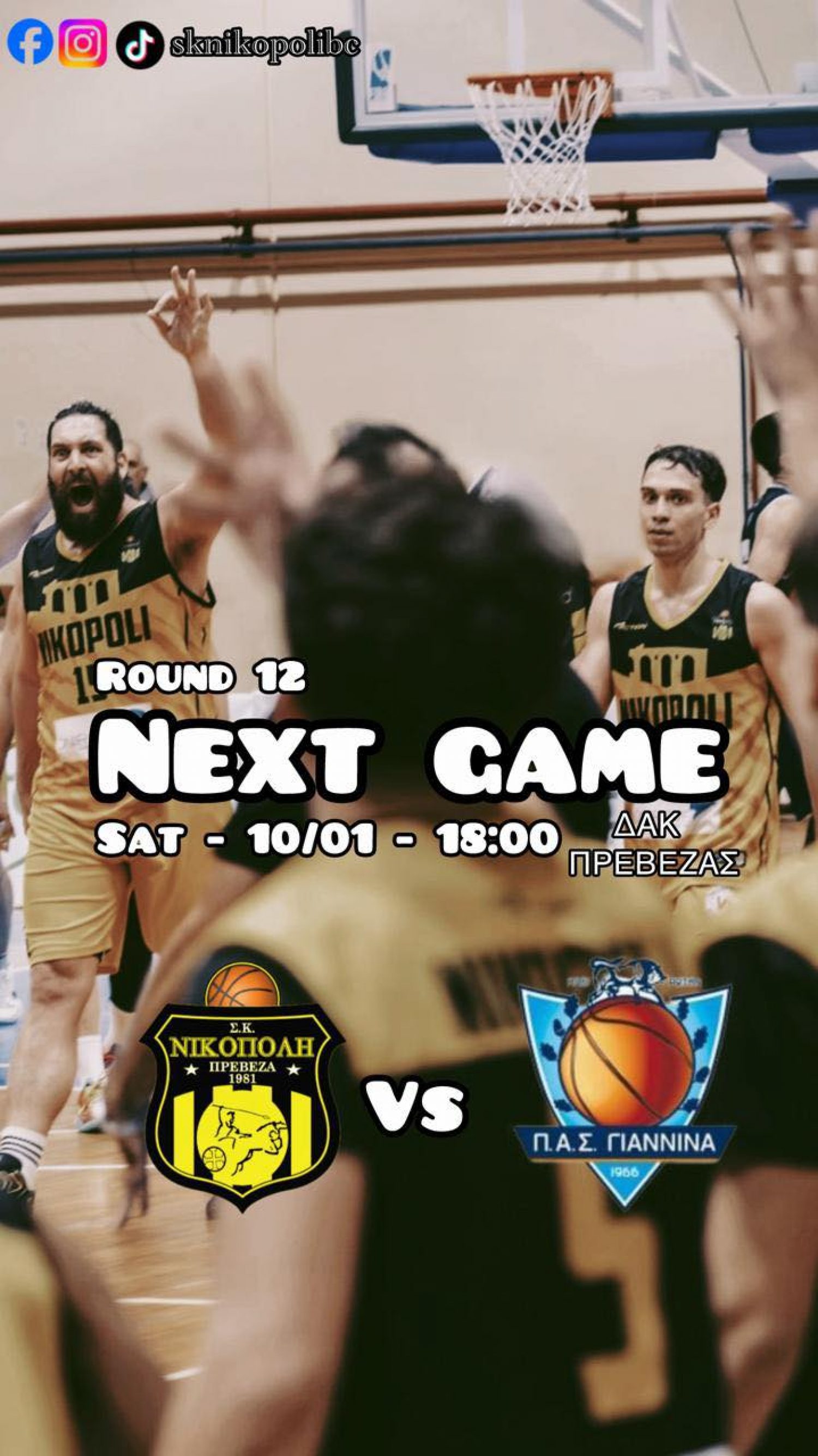 Ο Σύλλογος Καλαθοσφαίρισης Νικόπολη Πρέβεζας σας προσκαλεί το Σάββατο 10 Ιανουαρίου 2026, στις 18:00, στο ΔΑΚ Πρέβεζας, για τον εντός έδρας αγώνα της ανδρικής μας ομάδας απέναντι στον ΠΑΣ Γιάννενα.