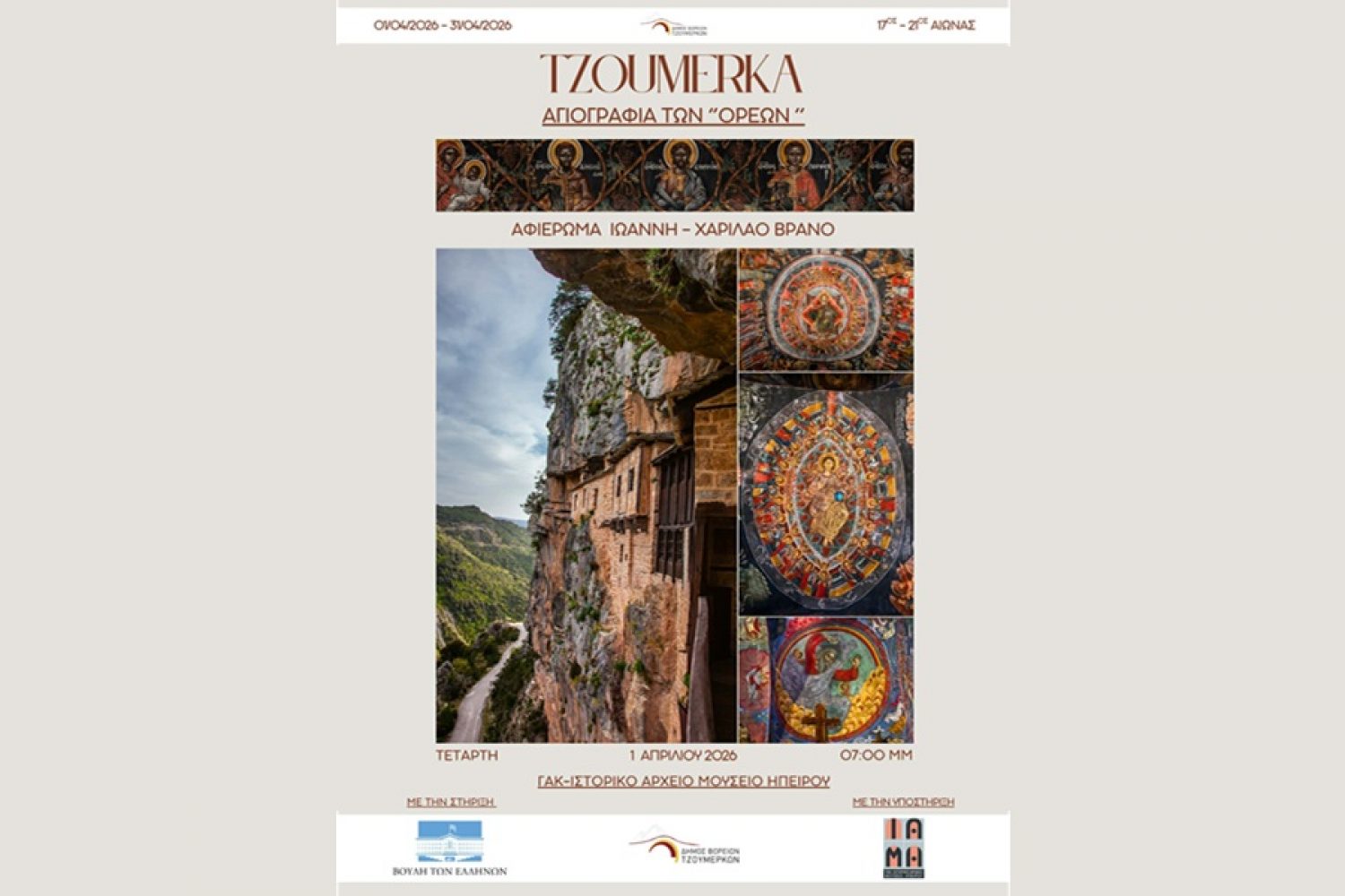Τα εγκαίνια της έκθεσης «Tzoumerka – Αγιογραφία των “Ορέων”» θα πραγματοποιηθούν την Τετάρτη 1 Απριλίου, στις 7 το απόγευμα. Η εκδήλωση θα ανοίξει με χαιρετισμούς και ένα καλωσόρισμα του δημάρχου Βορείων Τζουμέρκων Νίκου Βαΐτση. Θα ακολουθήσουν εισηγήσεις από τον προϊστάμενο Εφορείας Αρχαιοτήτων Θεσπρωτίας και αναπληρωτή προϊστάμενο Εφορείας Αρχαιοτήτων Ιωαννίνων Ιωάννη Χουλιάρα και τον αρχαιολόγο π. Γρηγόριο Μανόπουλο, ενώ στη συνέχεια ο Μιχάλης Χ. Βράνος θα παρουσιάσει το αφιέρωμα στον Χαρίλαο Ιωάννη Βράνο. Το πρόγραμμα περιλαμβάνει επίσης την εισήγηση της εντεταλμένης συμβούλου Πολιτισμού του Δήμου Βορείων Τζουμέρκων Ελισάβετ Μπούτσορα, ενώ έχει προβλεφθεί και χρόνος για συζήτηση με το κοινό.