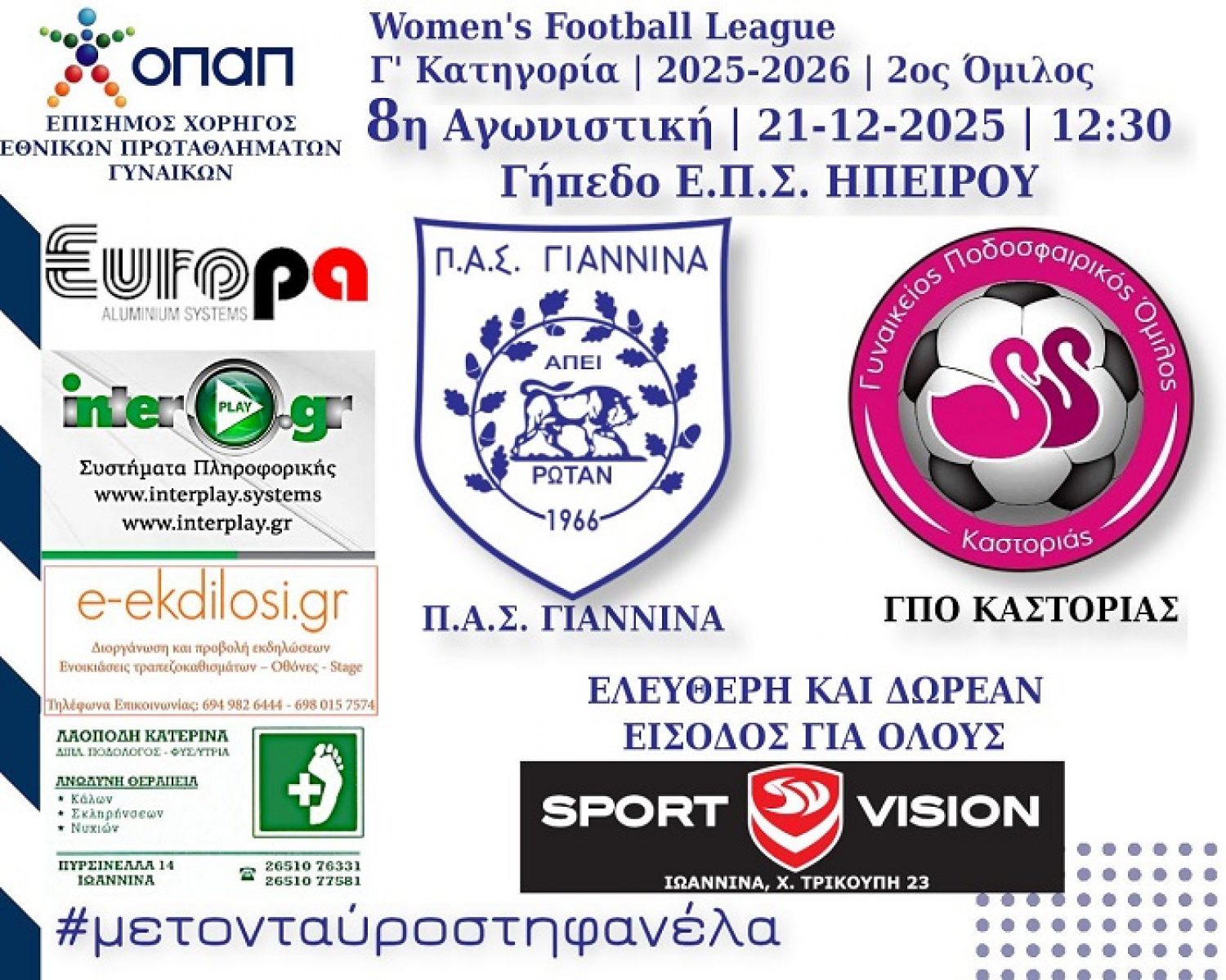 Οι Γυναίκες του Π.Α.Σ. ΓΙΑΝΝΙΝΑ υποδέχονται τον ΓΠΟ Καστοριάς, αυτή την Κυριακή, 21-12-2025, στις 12:30, στο Γήπεδο της ΕΠΣ Ηπείρου.
