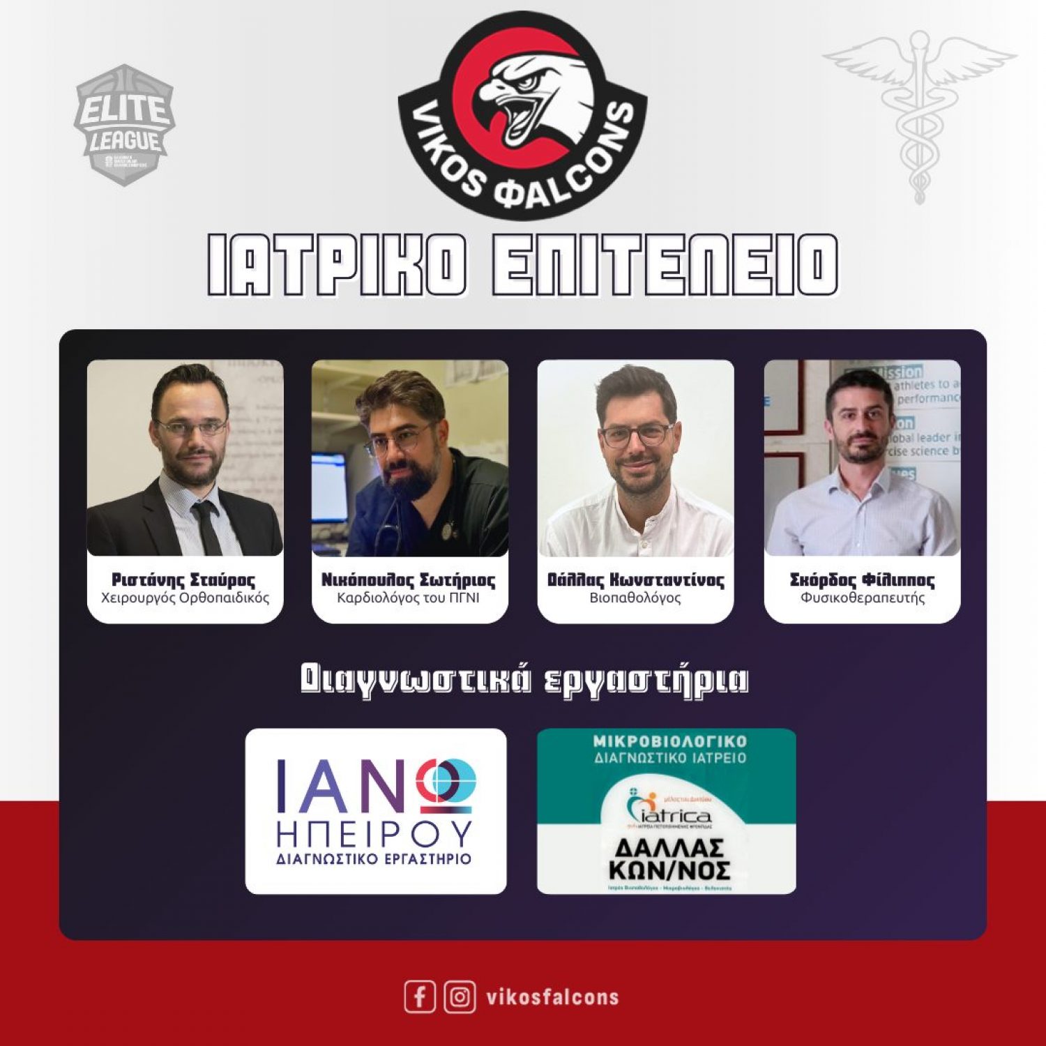 Η διοίκηση της ομάδας ανακοινώνει το ιατρικό επιτελείο που θα βρίσκεται δίπλα στους Vikos Φalcons καθόλη τη διάρκεια της απαιτητικής φετινής αγωνιστικής σεζόν στην Elite League.