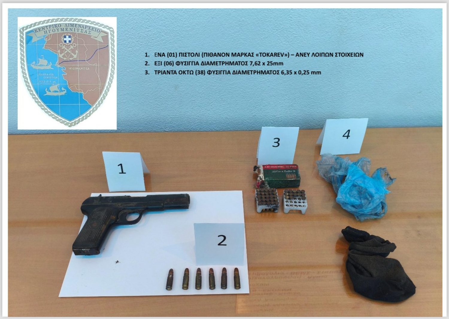 Αμέσως, στελέχη Λ.Σ.-ΕΛ.ΑΚΤ. μετέβησαν στο σημείο, όπου εντόπισαν το αντικείμενο, επιμελώς τυλιγμένο σε κάλτσα και το περισυνέλλεξαν. Κατόπιν ελέγχου διαπιστώθηκε ότι πρόκειται για ένα πιστόλι, πιθανόν μάρκας ‘’TOKAREV’’ μοντέλου ΤΤ-33 με γεμιστήρα, το οποίο παρουσίαζε έντονες οξειδώσεις και στοιχεία πολυκαιρισμού. Επίσης, ανευρέθηκαν μία νάιλον συσκευασία με έξι (6) φυσίγγια διαμετρήματος 7,62 mm, καθώς και μία χάρτινη συσκευασία περιέχουσα 38 φυσίγγια διαμετρήματος 6,35 mm. Από το Κεντρικό Λιμεναρχείο Ηγουμενίτσας που διενεργεί την προανάκριση, κατασχέθηκε το ανευρεθέν πυρομαχικό υλικό, το οποίο πρόκειται να αποσταλεί στο τμήμα εργαστηρίων της Υποδιεύθυνσης Εγκληματολογικών Ερευνών Βορείου Ελλάδος για περαιτέρω έρευνα.