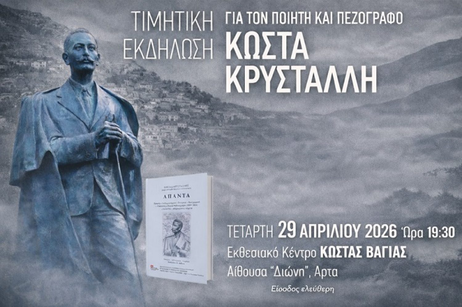Τιμητική εκδήλωση για τον ποιητή Κώστα Κρυστάλλη συνδιοργανώνουν οι Δήμοι Αρταίων και Βορείων Τζουμέρκων την Τετάρτη 29 Απριλίου, στις 7.30 το απόγευμα, στην Αίθουσα «Διώνη» του Εκθεσιακού Κέντρου «Κώστας Βάγιας», στην Άρτα.