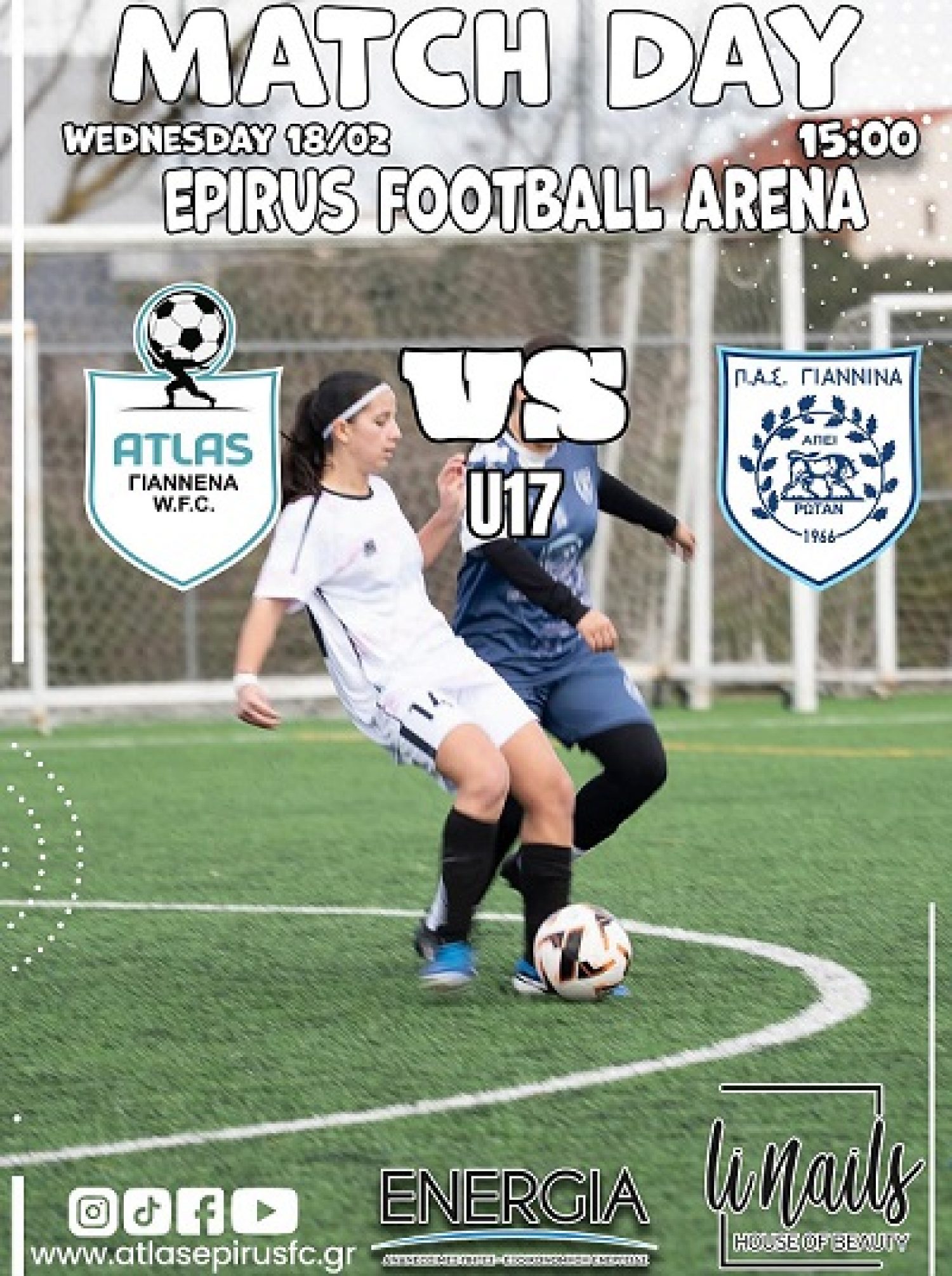 Την Τετάρτη 18 Φεβρουαρίου, συνεχίζεται ο αγώνας της 3ης αγωνιστικής του Πρωταθλήματος Κ-17 Γυναικών, ανάμεσα στον Άτλα Ήπειρος WFC και τον ΠΑΣ Γιάννινα WFT.