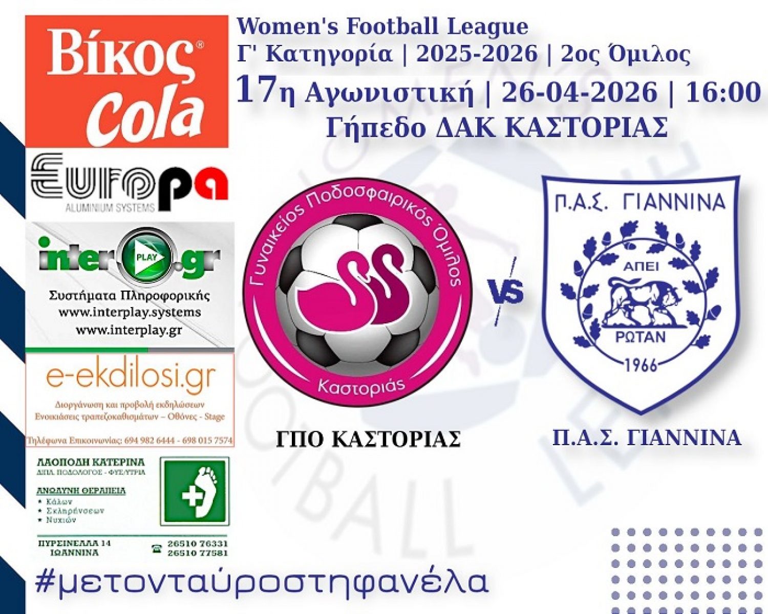 Η Ομάδα Ποδοσφαίρου Γυναικών Π.Α.Σ. ΓΙΑΝΝΙΝΑ θα αντιμετωπίσει τον ΓΠΟ ΚΑΣΤΟΡΙΑΣ για την 17η αγωνιστική του πρωταθλήματος, την Κυριακή, 26-04-2026, στις 16:00, στο ΔΑΚ Καστοριάς.