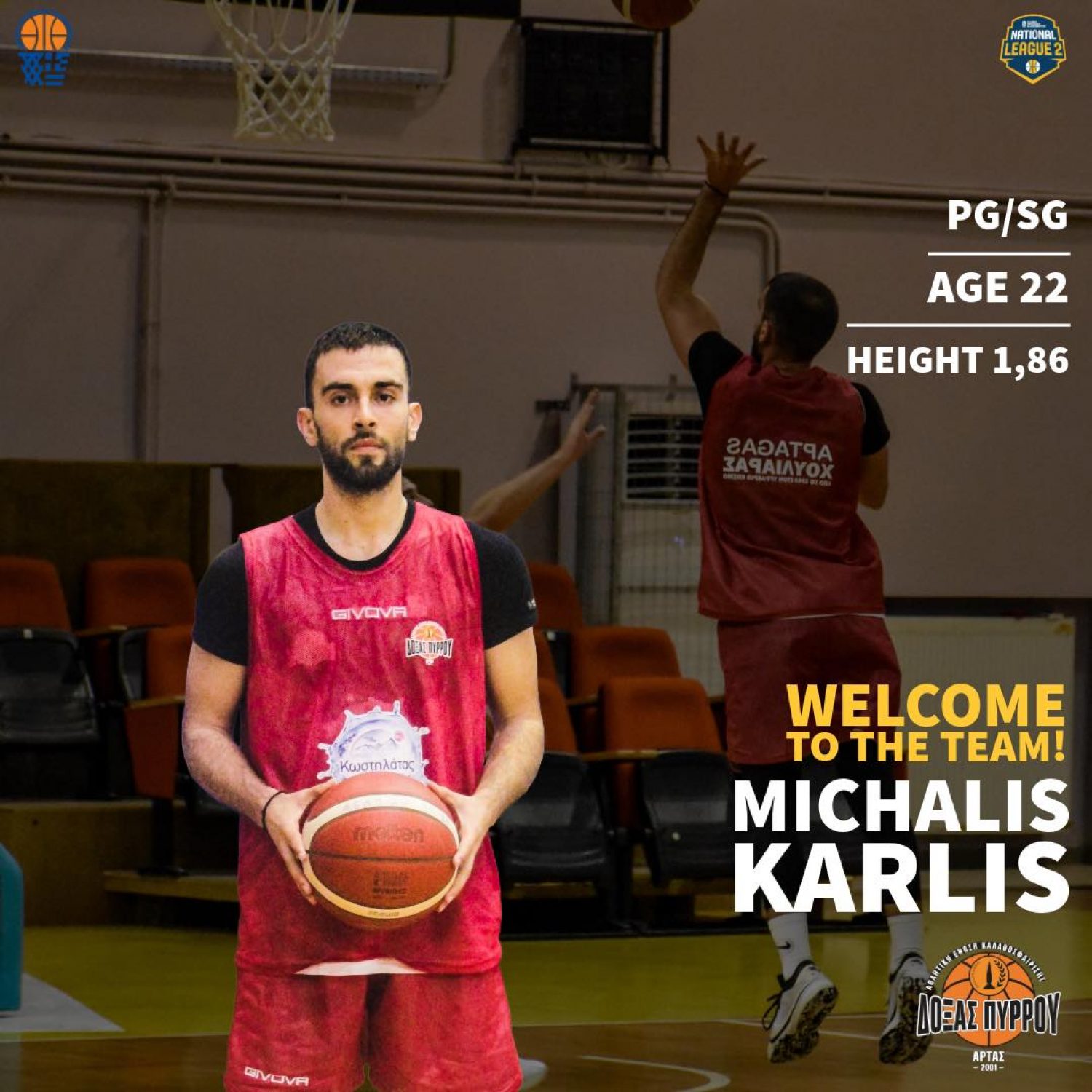 Η Α.Ε. Δόξας Πύρρου Άρτας 2001 ανακοινώνει την απόκτηση του Μιχάλη Καρλή. Ο 22χρονος, ύψους 1,86μ point guard/ shooting guard, αγωνιζόταν μέχρι πρότινος στη Σαρωνίδα (Β Εθνική). Την περασμένη αγωνιστική περίοδο βρέθηκε αντιμέτωπος με την ομάδα μας φορώντας τη φανέλα του Αστέρα Τέμενης, ενώ στο παρελθόν έχει αγωνιστεί στην Αναγέννηση Αρκαλοχωρίου (Β Εθνική), στους Dornbirn Lions (Αυστρία), στα ανδρικά και εφηβικά τμήματα της ΑΕΚ, καταγράφοντας συμμετοχές και στην Α1 με τη φανέλα του δικεφάλου, ενώ ξεκίνησε την καριέρα του από τις ακαδημίες του Ηροδότου.