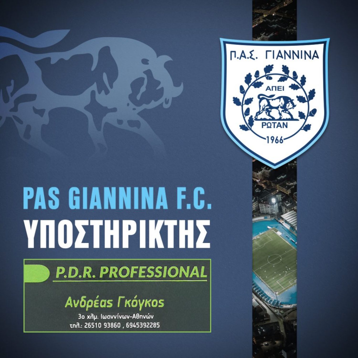 H Π.Α.Ε. Π.Α.Σ. ΓΙΑΝΝΙΝΑ 1966 θέλει να ευχαριστήσει την εταιρία “P.D.R. PROFESSIONAL – Αντρέας Γκόγκος” για την υποστήριξη της στη φετινή δύσκολη χρονιά της ομάδας μας συμμετέχοντας μέσα από το χορηγικό μας πρόγραμμα.