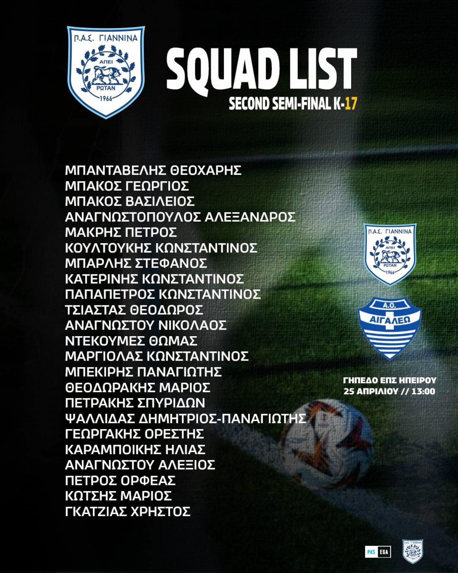 Η Π.Α.Ε. Π.Α.Σ. ΓΙΑΝΝΙΝΑ ενημερώνει τον φίλαθλο κόσμο ότι, παρά την επιθυμία και τις προσπάθειες που καταβλήθηκαν ώστε ο αγώνας της ομάδας Κ17 με το Αιγάλεω να διεξαχθεί στο Εθνικό Στάδιο «Ζωσιμάδες», αυτό δεν κατέστη δυνατό λόγω της διεξαγωγής διασυλλογικών αγώνων στίβου.