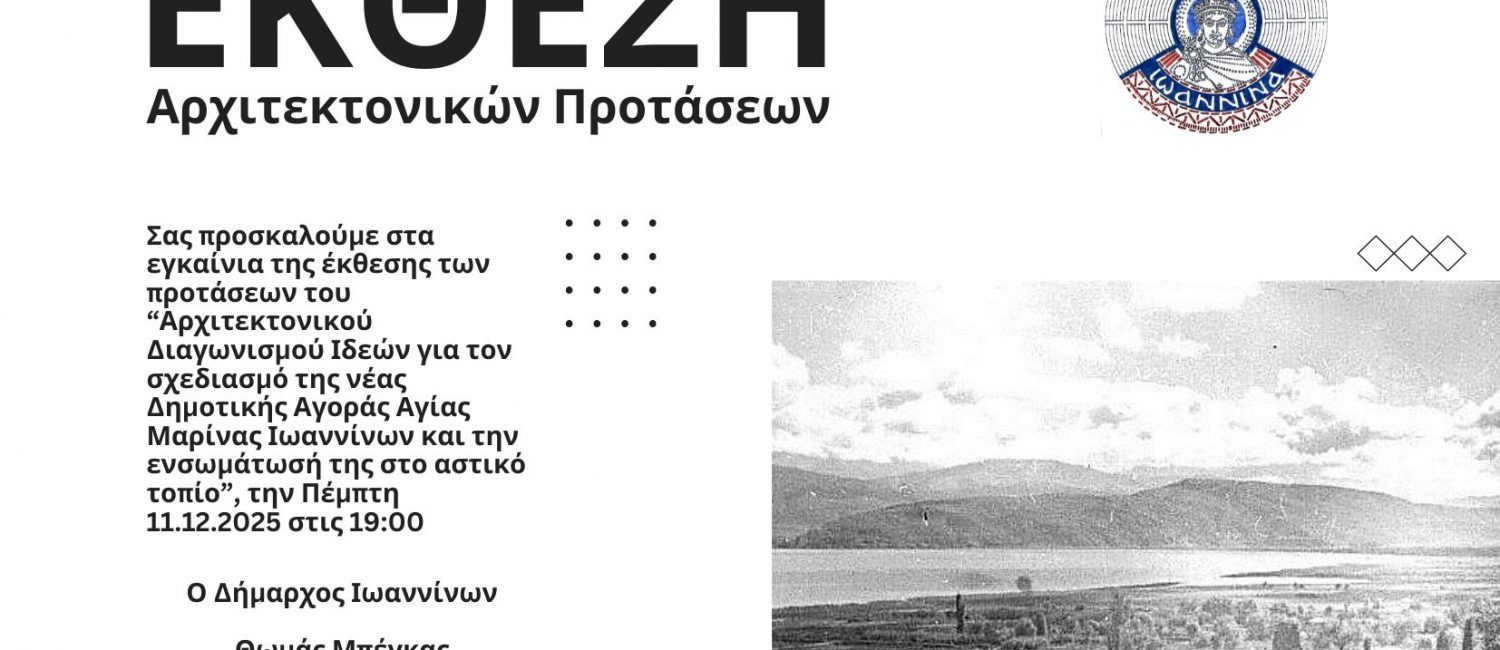 Ο Δήμος Ιωαννιτών διοργανώνει έκθεση των μελετών που κατατέθηκαν στη διαδικασία του «Αρχιτεκτονικού Διαγωνισμού Ιδεών για τον σχεδιασμό της νέας Δημοτικής Αγοράς Αγίας Μαρίνας Ιωαννίνων και την ενσωμάτωσή της στο αστικό τοπίο».