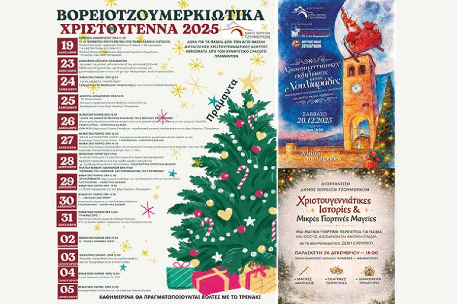 Με επίκεντρο τη φωταγώγηση του χριστουγεννιάτικου δέντρου στα Πράμαντα και ένα πλούσιο πρόγραμμα δράσεων για μικρούς και μεγάλους, ο Δήμος Βορείων Τζουμέρκων παρουσιάζει τις «Βορειοτζουμερκιώτικες Χριστουγεννιάτικες Εκδηλώσεις 2025», που απλώνονται χρονικά από τις 19 Δεκεμβρίου έως και τις 5 Ιανουαρίου.