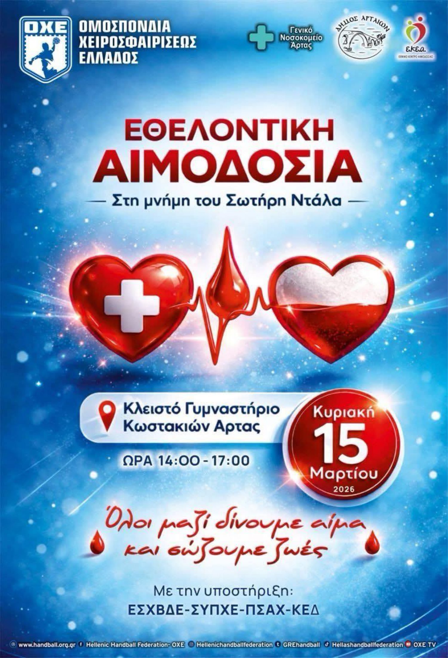Η Ομοσπονδία Χειροσφαιρίσεως Ελλάδος (ΟΧΕ) διοργανώνει Αιμοδοσία στο πλαίσιο του Final Four του Κυπέλλου Γυναικών στην Άρτα, την Κυριακή 15 Μαρτίου, στη μνήμη του Σωτήρη Ντάλα, πρώην αθλητή και προπονητή της Αναγέννησης Άρτας, που έφυγε από τη ζωή τόσο νωρίς σε ηλικία 39 ετών