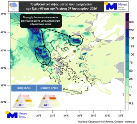 Οι βροχές που εκδηλώνονται, κατά κύριο λόγο στα δυτικά, στη Θράκη και στο Ανατολικό Αιγαίο, θα παρουσιάσουν σταδιακή ενίσχυση έως το βράδυ. Καταιγίδες θα σημειωθούν από το μεσημέρι στα δυτικά και βόρεια. Παράλληλα οι νότιοι άνεμοι που επικρατούν στα πελάγη θα παρουσιάσουν μικρή ενίσχυση και προς το τέλος του εικοσιτετράωρου στο Αιγαίο θα φτάνουν κατά τόπους τα 7 μποφόρ*. Στο Ιόνιο δεν αναμένεται να ξεπεράσουν τα 5 έως 6 μποφόρ*. Σύμφωνα με την κατηγοριοποίηση των επεισοδίων βροχόπτωσης (Regional Precipitation Index), η οποία εφαρμόζεται από τη μονάδα Meteo του Εθνικού Αστεροσκοπείου Αθηνών, το επεισόδιο βροχόπτωσης για την Τρίτη 06/01 κατατάσσεται στην Κατηγορία 3 (Σημαντική). Την Τετάρτη 07/01 τα φαινόμενα θα επηρεάσουν και την υπόλοιπη χώρα. Σύμφωνα με τα έως τα έως τώρα διαθέσιμα προγνωστικά στοιχεία, το απόγευμα και τις βραδινές ώρες, οι βροχές και οι καταιγίδες στα δυτικά ηπειρωτικά και ενδεχομένως στη Θράκη, θα είναι κατά τόπους ισχυρές. Ως εκ τούτου το επεισόδιο βροχόπτωσης για την Τετάρτη 07/01 αναμένεται να είναι Κατηγορίας 4 (Πολύ Σημαντική). Οι νότιοι άνεμοι στο Αιγαίο θα φτάνουν τα 7 και κατά τόπους τα 8 μποφόρ*. Στο Ιόνιο οι νότιοι άνεμοι δεν θα ξεπερνούν τα 6 έως 7 μποφόρ, στρεφόμενοι από τις πρώτες βραδινές ώρες σε δυτικούς ίδιας έντασης*.