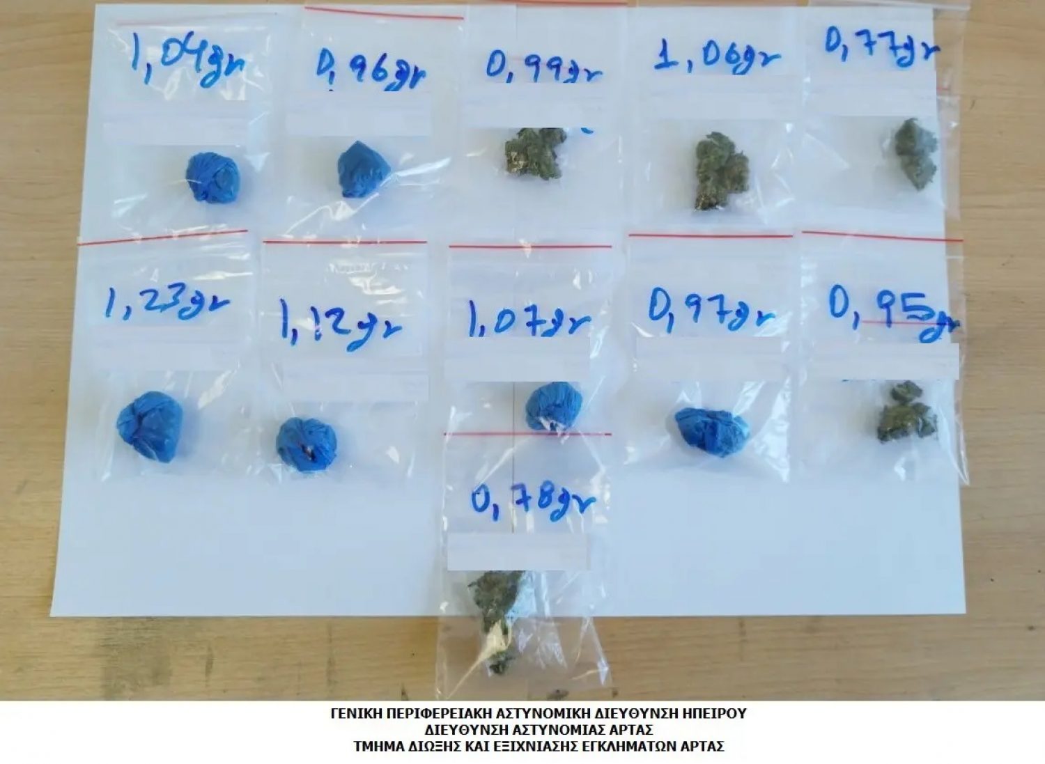 Ειδικότερα, η μία περίπτωση αφορά ανήλικο ημεδαπό, ο οποίος κατηγορείται για διακίνηση ναρκωτικών, αφού σε έλεγχο αστυνομικών του Τμήματος Δίωξης και Εξιχνίασης Εγκλημάτων Άρτας, βρέθηκαν στην κατοχή του και κατασχέθηκαν -11- ανισοβαρείς συσκευασίες με ακατέργαστη κάνναβη, συνολικού βάρους -10,94- γραμμαρίων. Στο πλαίσιο της ίδιας υπόθεσης συνελήφθη και η μητέρα του για παραμέληση της εποπτείας του και αμφότεροι θα οδηγηθούν στην Εισαγγελία Πρωτοδικών Άρτας.
