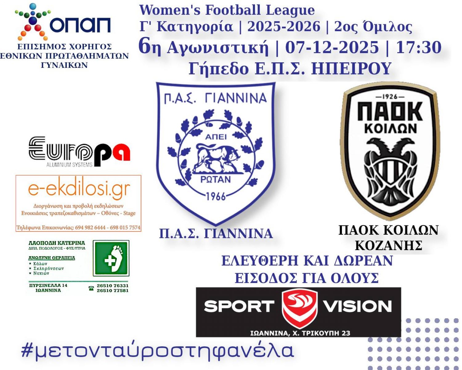 Το ντέρμπι της χρονιάς για την Ομάδα Ποδοσφαίρου Γυναικών Π.Α.Σ. ΓΙΑΝΝΙΝΑ, που θα αντιμετωπίσει την Ομάδα Γυναικών του ΠΑΟΚ Κοίλων Κοζάνης, για την 6η αγωνιστική του πρωταθλήματος.