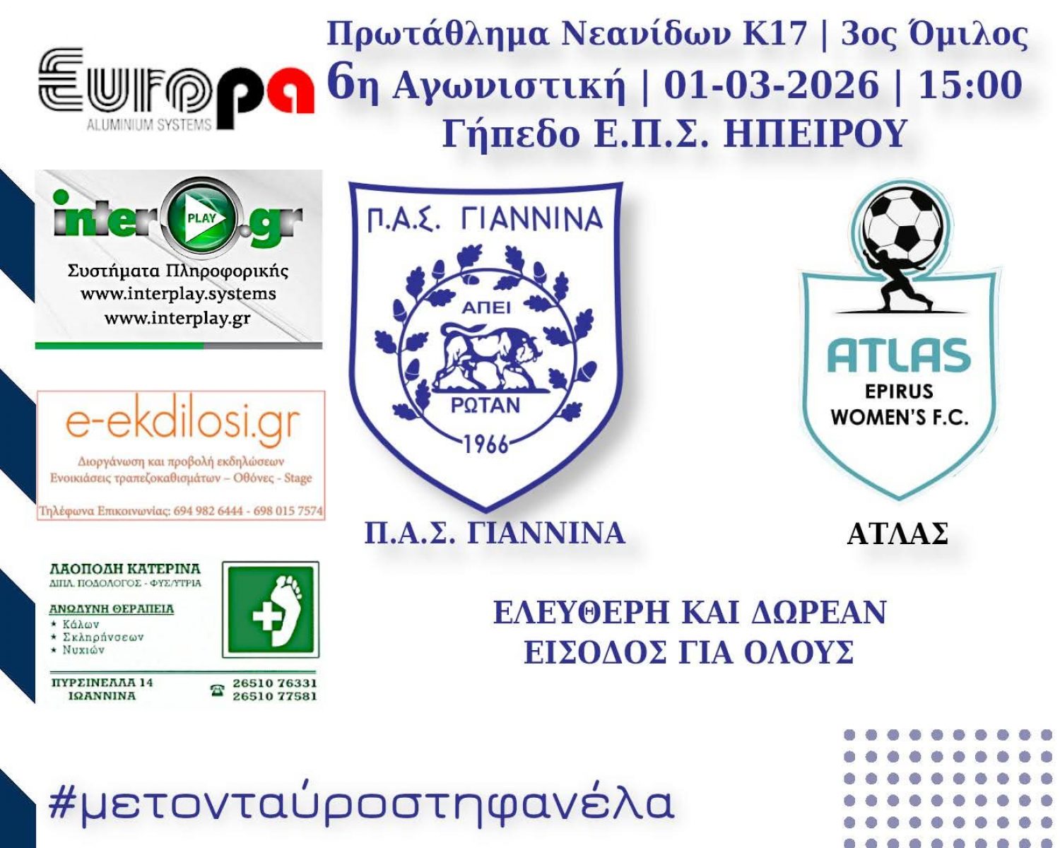 Η Κ17 Νεανίδων Π.Α.Σ. ΓΙΑΝΝΙΝΑ, θα αντιμετωπίσει την αντίστοιχη του Άτλα, για την τελευταία αγωνιστική της φάσης των Ομίλων, του Πανελλήνιου Πρωταθλήματος Κ17 Νεανίδων, την Κυριακή, 01-03-2026, στις 15:00, στο Γήπεδο της ΕΠΣ Ηπείρου.