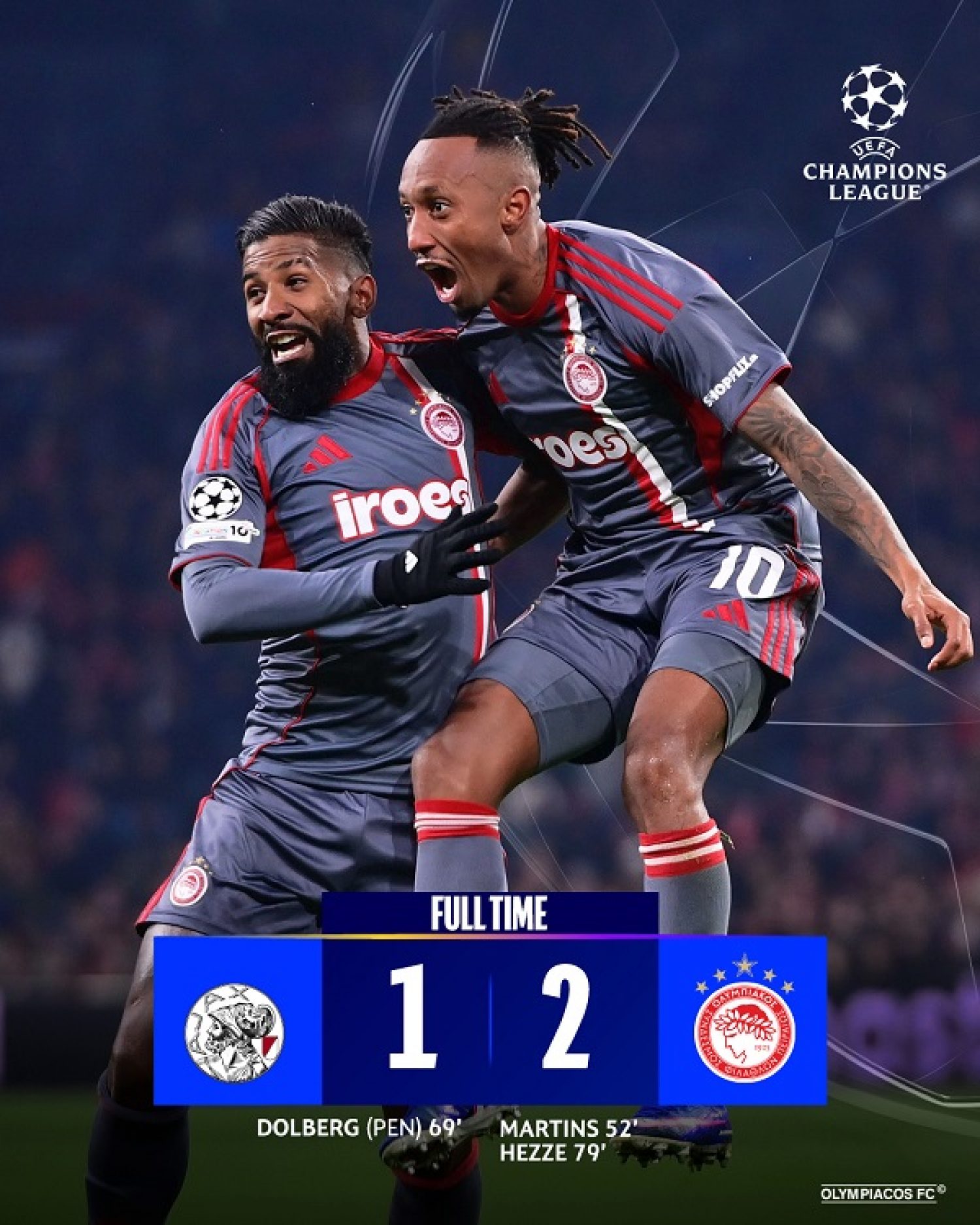 Ο Ολυμπιακός πήρε διπλό πρόκρισης στο Άμστερνταμ, και συνεχίζουν στην ενδιάμεση φάση του Champions League.