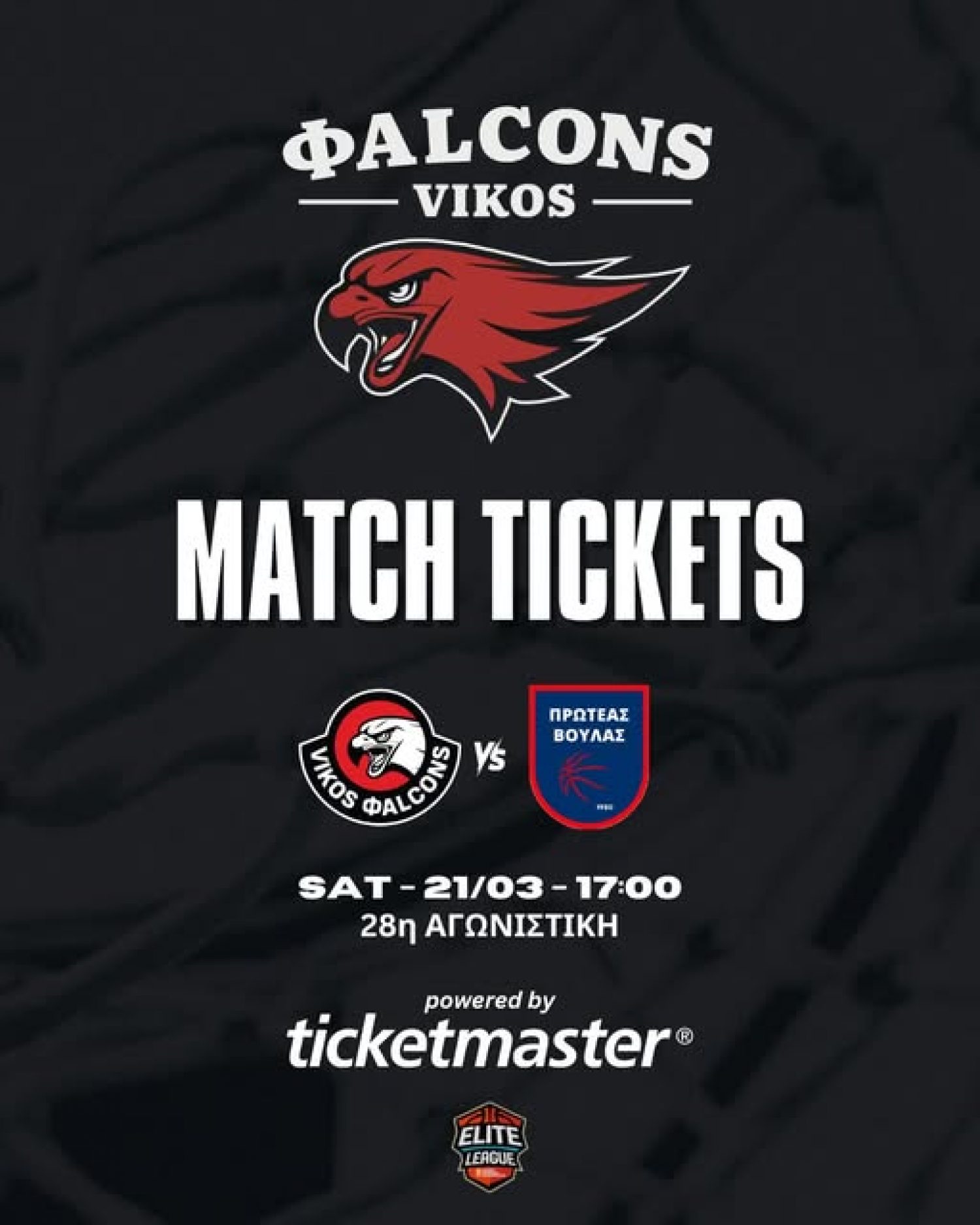 Διαθέσιμα για προπώληση τα εισιτήρια του αγώνα για την 28η αγωνιστική του πρωταθλήματος της Elite League 2025-26 μεταξύ των Vikos Φalcons και του Πρωτέα Βούλας, που θα διεξαχθεί το Σάββατο 21/3 στις 17:00 στο Κλειστό Γυμναστήριο Ιωαννίνων "Σιδέρης Καραδήμας".