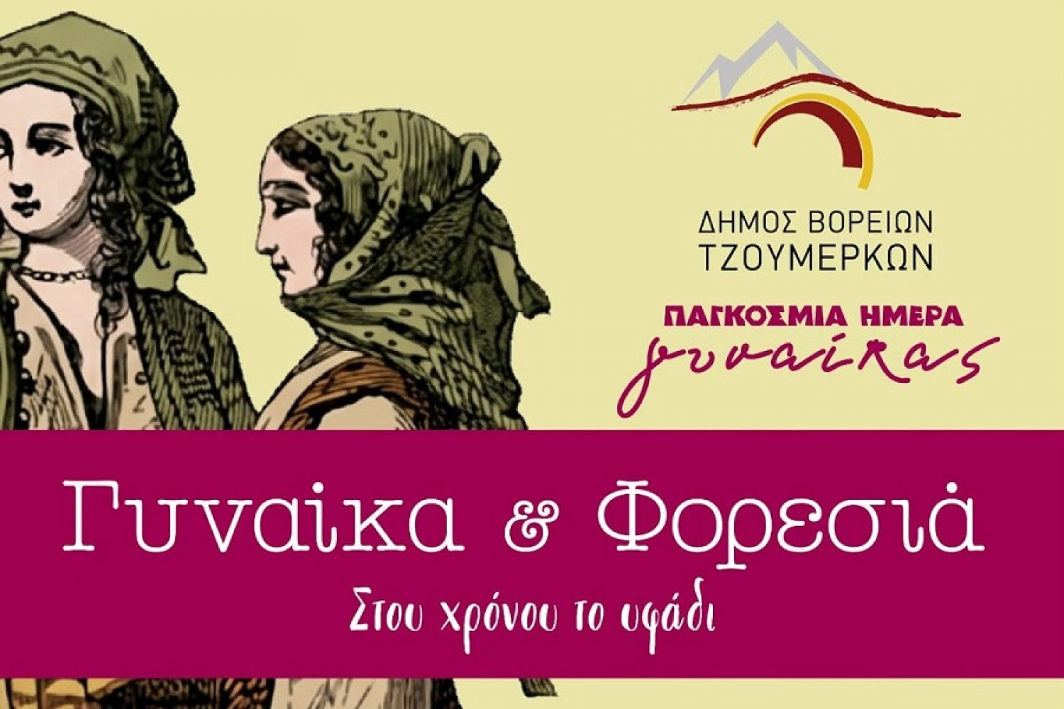 Την εκδήλωση «Γυναίκα & Φορεσιά – Στου χρόνου το υφάδι» διοργανώνει ο Δήμος Βορείων Τζουμέρκων την Κυριακή 8 Μαρτίου, στη 1 το μεσημέρι, στο «Κτήμα Θεοχάρη», με αφορμή την Παγκόσμια Ημέρα της Γυναίκας.