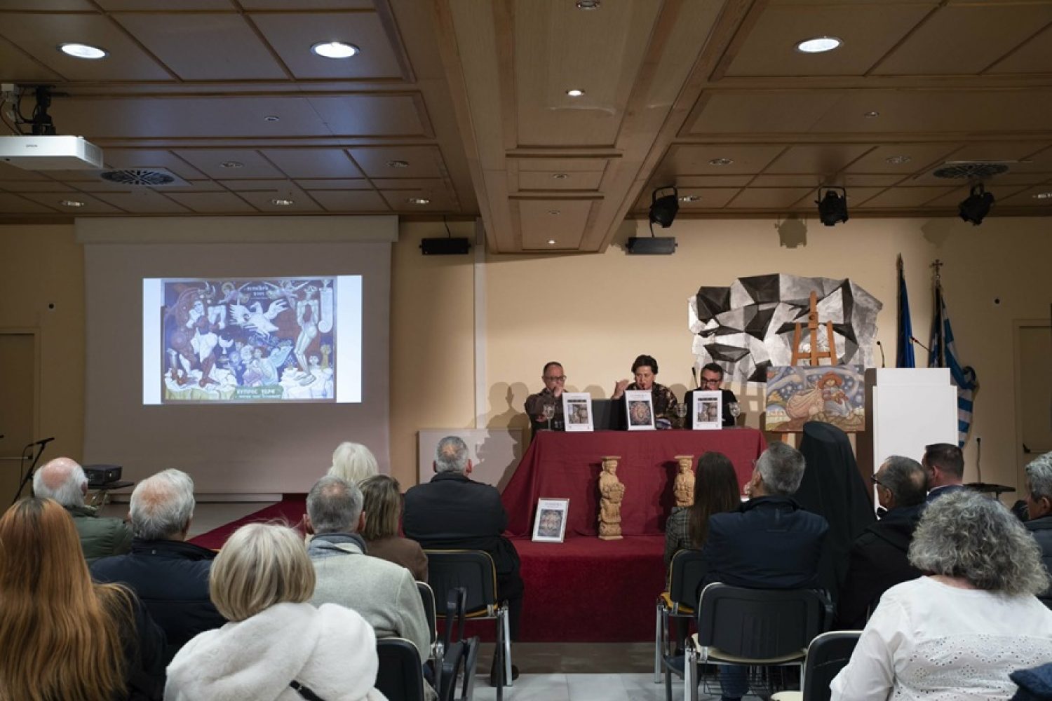 Στο καλωσόρισμά του, ο δήμαρχος Βορείων Τζουμέρκων Νίκος Βαΐτσης στάθηκε στην ευθύνη της τοπικής αυτοδιοίκησης να διαφυλάξει και να αναδείξει την τέχνη που γεννήθηκε στα Κατσανοχώρια και στα Τζουμέρκα. Όπως ανέφερε, «κρατάμε δύο βασικά στοιχεία: τη φλόγα της δημιουργίας και την ανάγκη να κρατήσουμε ζωντανό τον τόπο». Ιδιαίτερη αναφορά έκανε στο φαινόμενο της ερημοποίησης, σημειώνοντας ότι πολλές εκκλησίες παραμένουν κλειστές και ανοίγουν σπάνια, τονίζοντας την ανάγκη «να φουντώσει μέσα μας η φλόγα της διατήρησης». Παράλληλα, επεσήμανε ότι, όπως οι παλιοί αγιογράφοι εργάζονταν σε μπουλούκια, έτσι και σήμερα απαιτείται συλλογική προσπάθεια. Ευχαρίστησε όλους τους συντελεστές της εκδήλωσης, με ιδιαίτερη μνεία στην κα Μπούτσορα για την πρωτοβουλία και τον συντονισμό της διοργάνωσης. Χαιρετισμό απηύθυνε ο Αρχιμανδρίτης πατήρ Ιερώνυμος, ως εκπρόσωπος της Μητρόπολης Ιωαννίνων, τονίζοντας ότι «ολόκληρη η Ήπειρος αποτελεί ένα ζωντανό μουσείο», ενώ συνεχάρη τον Δήμο Βορείων Τζουμέρκων για την πρωτοβουλία και την υλοποίηση της έκθεσης. Αναγνώστηκε επίσης χαιρετισμός του Μητροπολίτη Άρτης κ. Καλλίνικου. Τη στήριξη της Περιφέρειας Ηπείρου εξέφρασε ο αντιπεριφερειάρχης Εθελοντισμού Κώστας Κίτσιος, επισημαίνοντας ότι τα Τζουμέρκα αποτελούν μια «κοιτίδα πολιτισμού», που ανέδειξε σημαντικούς καλλιτέχνες της πίστης. Η διευθύντρια των ΓΑΚ – Ιστορικό Αρχείο Μουσείο Ηπείρου Μάρθα Παπαδοπούλου, υπογράμμισε ότι η συγκεκριμένη πρωτοβουλία «δεν αποτελεί μόνο μια παρουσίαση, αλλά μια πρόσκληση για τη διαφύλαξη ενός πολύτιμου θησαυρού», αναδεικνύοντας τον ρόλο της έκθεσης ως μέσου ευαισθητοποίησης και προστασίας της πολιτιστικής κληρονομιάς. Στο κύριο μέρος της εκδήλωσης παρουσιάστηκαν εισηγήσεις που ανέδειξαν την ιστορική και καλλιτεχνική διάσταση της αγιογραφίας στην περιοχή. Ο προϊστάμενος της Εφορείας Αρχαιοτήτων Θεσπρωτίας και αναπληρωτής προϊστάμενος της Εφορίας Αρχαιοτήτων Ιωαννίνων Ιωάννης Χουλιαράς παρουσίασε την έρευνά του με τίτλο «Η εντοίχεια ζωγραφική του 17ου αιώνα στα Κατσανοχώρια και την κοιλάδα του Αράχθου ποταμού», φωτίζοντας μια σημαντική περίοδο της τοπικής καλλιτεχνικής παραγωγής. Ακολούθησε η ομιλία του πατρός και αρχαιολόγου Γρηγόρη Μανόπουλου, ο οποίος αναφέρθηκε αναλυτικά στους ζωγράφους από τα Κατσανοχώρια, στα οργανωμένα συνεργεία τους και στο έργο που άφησαν, τεκμηριώνοντας τη συμβολή τους στη διαμόρφωση της εκκλησιαστικής τέχνης. Στη συνέχεια, η Ελισάβετ Μπούτσορα ανέγνωσε την ομιλία του γιου του Χαρίλαου – Ιωάννη Βράνου, Μιχαήλ Βράνου, ο οποίος δεν μπόρεσε να παραστεί. Όπως επισημάνθηκε, «η τέχνη σε αυτόν τον τόπο δεν σταμάτησε ποτέ, απλώς περνά από γενιά σε γενιά», ενώ παρουσιάστηκαν στοιχεία από τη ζωή και το έργο του Χαρίλαου – Ιωάννη Βράνου. Στη δική της τοποθέτηση, η κα Μπούτσορα αναφέρθηκε στο χρονικό υλοποίησης της έκθεσης, στην επιλογή να ξεκινήσει από την Αθήνα, καθώς και στη σημαντική συμβολή της Βουλής των Ελλήνων. Ευχαρίστησε επίσης τις Ιερές Μητροπόλεις Ιωαννίνων και Άρτας για τη συνεργασία και την άδεια πρόσβασης σε ναούς, ώστε να πραγματοποιηθούν οι απαραίτητες φωτογραφίσεις. Όπως τόνισε, η παρουσίαση στα Γιάννενα σηματοδοτεί το κλείσιμο ενός κύκλου για την αγιογραφία των Ορέων, ανοίγοντας παράλληλα έναν νέο. «Ο πολιτισμός μας ενώνει και είναι το μέλλον του τόπου», κατέληξε. Σ