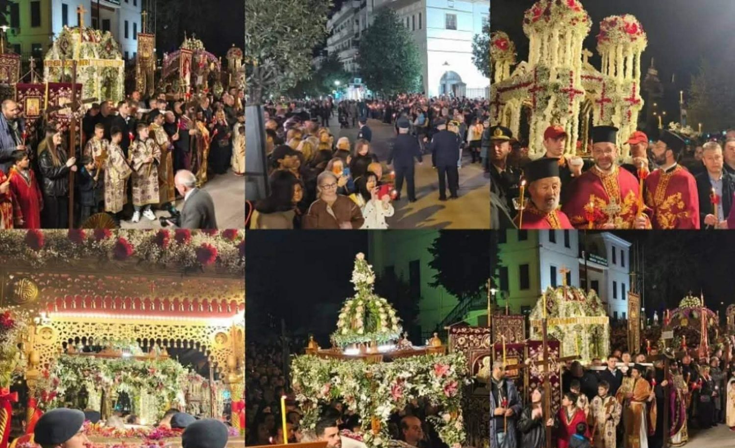 Οι Επιτάφιοι από τον Άγιο Νικόλαο Κοπάνων, την Περίβλεπτο, την Αγία Μαρίνα, τον Άγιο Γεώργιο, το Αρχιμανδρειό και τη Μητρόπολη, διέσχισαν τους δρόμους της πόλης ψάλλοντας τα Εγκώμια, για να καταλήξουν στο σημείο της συνάντησης.