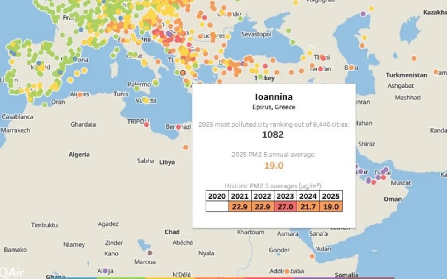Η έκθεση IQAir 2025, η οποία ανέλυσε δεδομένα από 9.446 πόλεις σε όλο τον κόσμο, τοποθετεί τα Ιωάννινα στην 782η θέση της παγκόσμιας κατάταξης με τις πιο μολυσμένες πόλεις.